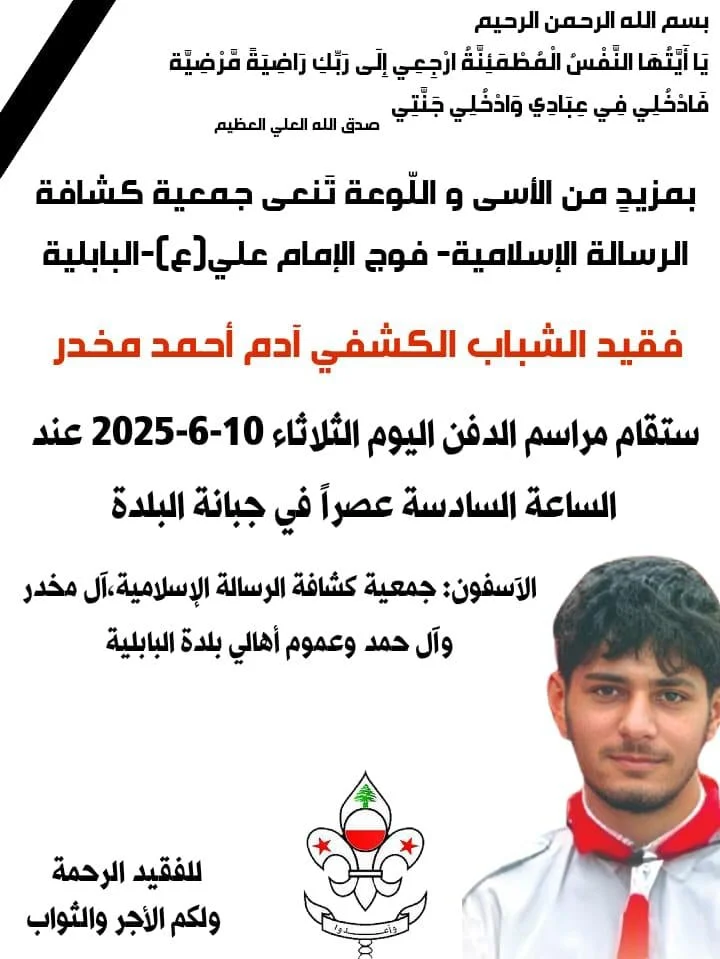 وقد نعت كشافة “الرسالة الاسلامية” الكشفي ادم مخدر وسيتم تشييعه عند السادسة من عصر اليوم في جبانة بلدته البابلية.