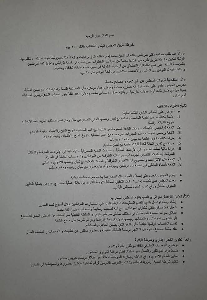 وفيما يلي نص خارطة الطريق التي التزم بها المجلس البلدي في طرابلس خلال مهلة الـ100 يوم: